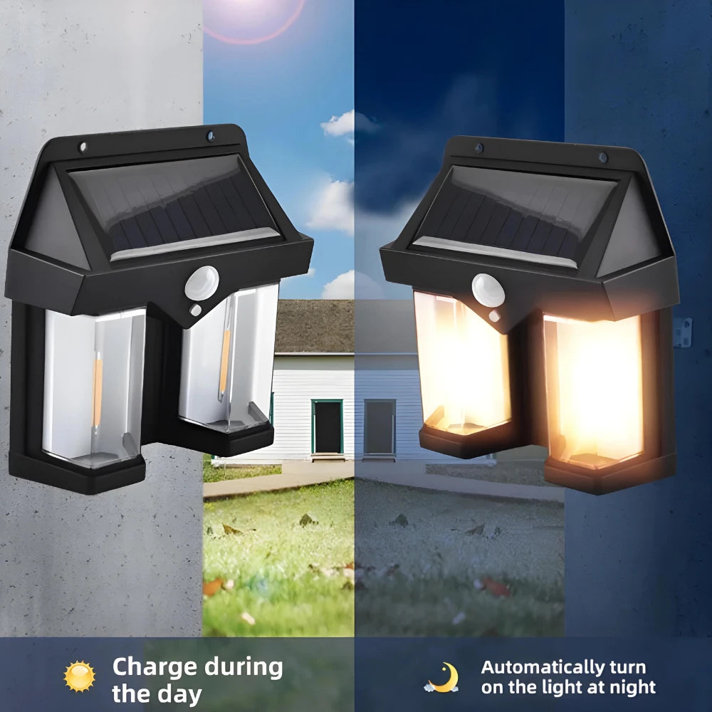 Potência e Eficiência: Equipada com duas lâmpadas de tungstênio de 2W / 1200LM, nossa arandela solar garante uma iluminação eficiente sem gastar muita energia.